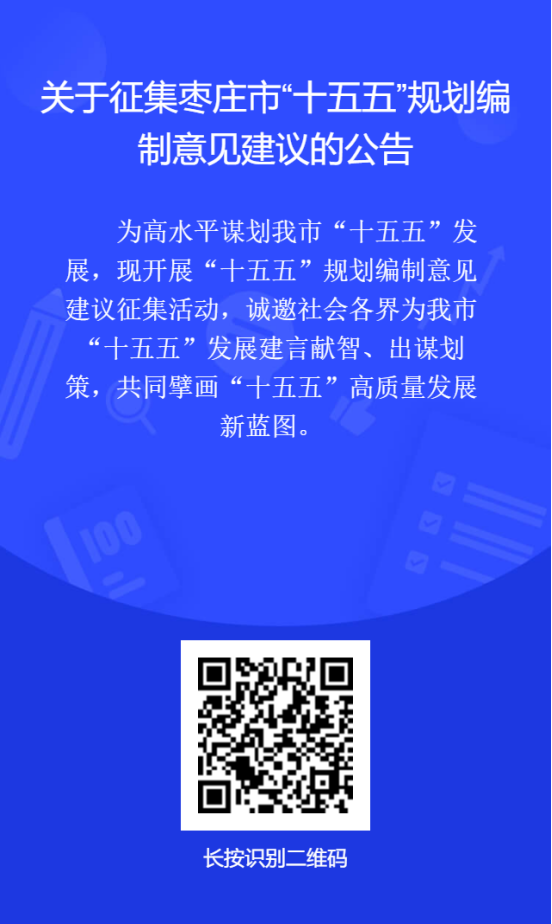 “十五五”时期是我市扎实推进新时代社会主义现代化强市建设的关键五年。为贯彻落实习近平总书记关于“十五五”规划编制工作的重要指示精神,更好地谋划枣庄市“十五五”发展蓝图,问计于民、集思广益、群策群力、凝聚共识,现面向社会各界征集“十五五”规划编制意见建议。